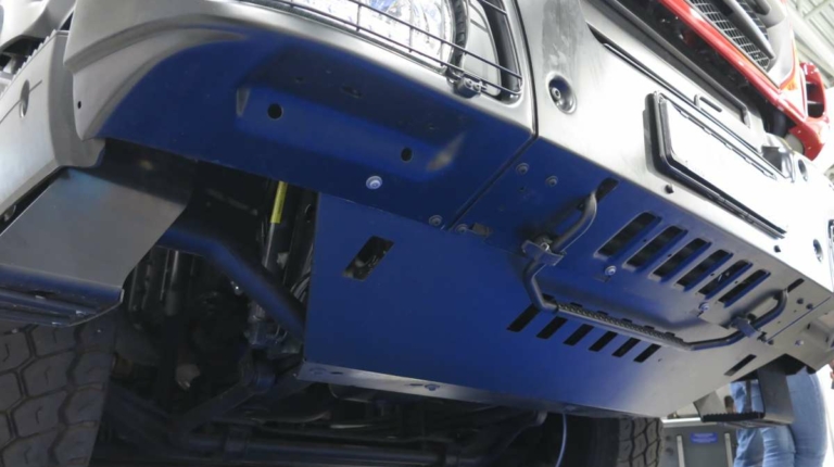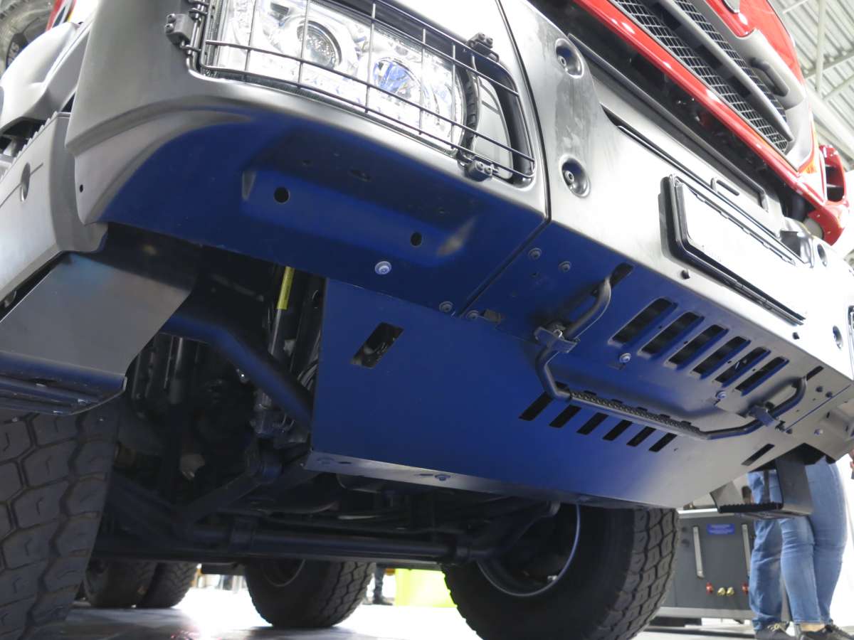 Спереди стоят усиленные 9-тонные мосты, сзади – сдвоенный, 32-тонный. Рама отличается повышенной прочностью и изготовлена из профиля 309х80х10 мм. Дорожный просвет составляет 35 см. Двигатель защищен снизу металлической пластиной . Кстати, передний бампер тоже металлический и состоит их трех частей, что облегчает его замену в случае повреждения.