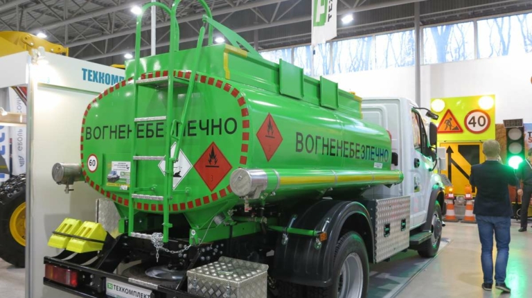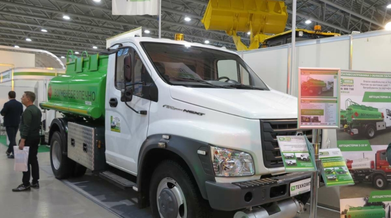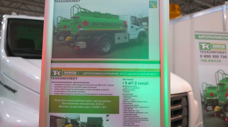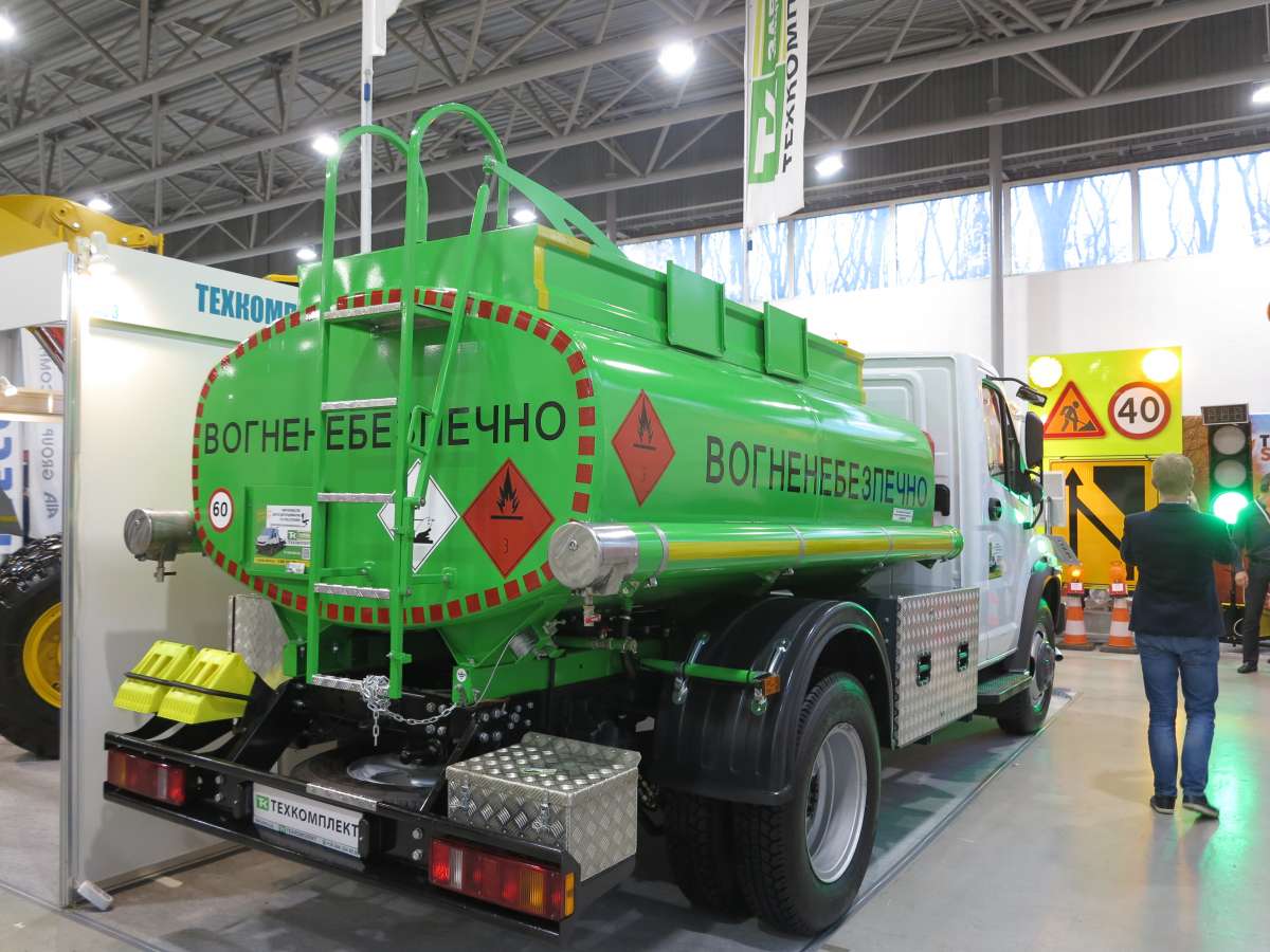 На стенде компании, внутри павильона можно увидеть еще и 5-кубовый автотопливозаправщик на шасси ГАЗон Next. «Техкомплект» изготавливает автотопливозаправщики на собственном предприятии, применяя современную окрасочную камеру. В последнее время в связи с бурным ростом дорожного строительства спрос на такие машины очень даже неплохой.