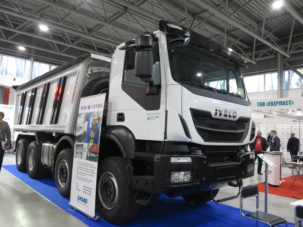 Компания «АМАКО» привезла строительный самосвал IVECO Trakker AD410T41 c колесной формулой 8х4. Машина имеет кузов известного итальянского производителя Gervasi и рассчитана на полную массу в 41 тонну. Двигатель – 13-литровый турбодизель Сursor 13 стандарта Евро 5, мощностью 410 л.с. Коробка передач – механическая, 16-ступенчатая ZF 16S220.