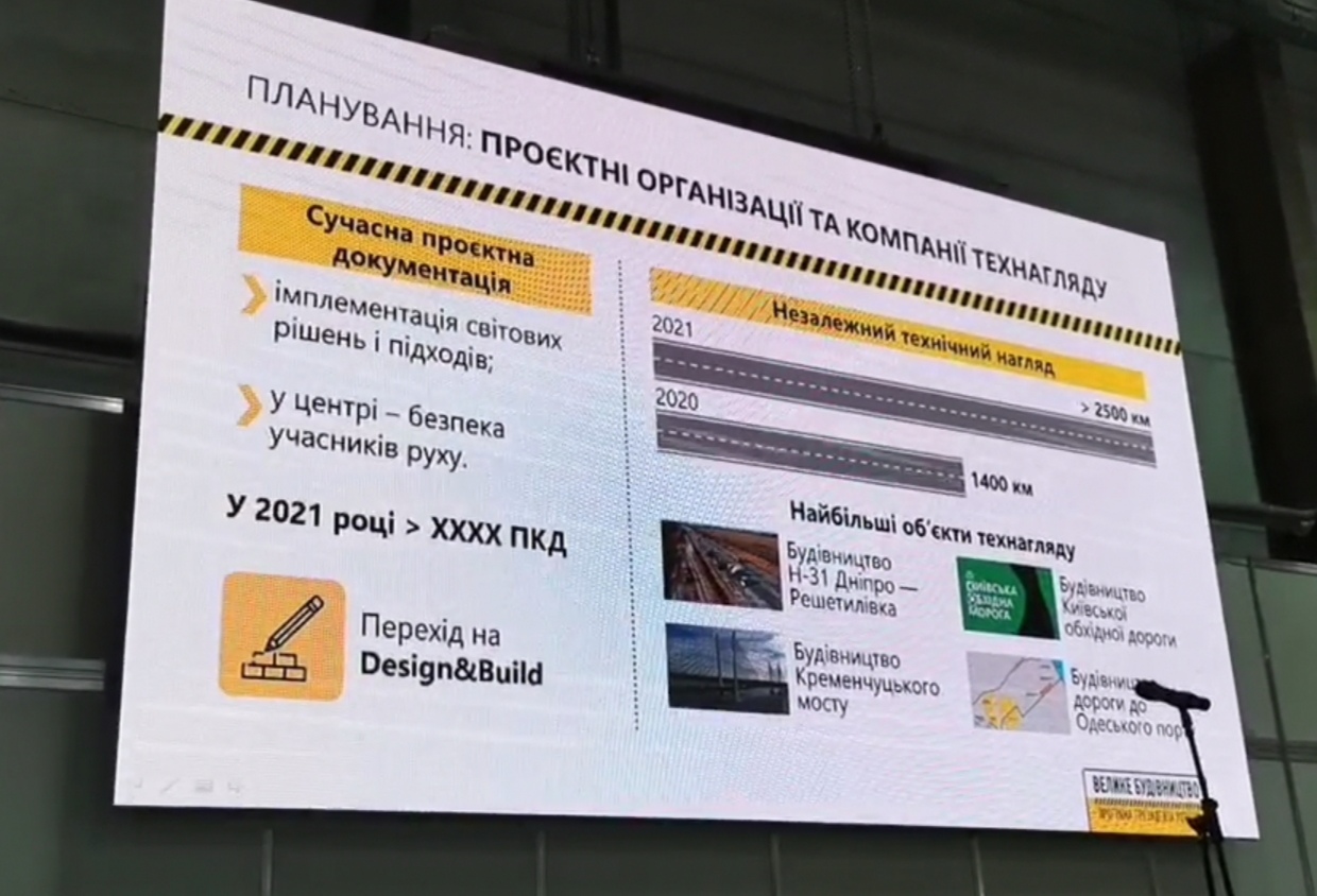Серед знакових об’єктів: дорога Н31 Дніпро – Решетилівка, будівництво Київської об’їзної дороги та Кременчуцького мосту, зведення дороги до Одеського порту тощо. Очікується, що в 2021 році під техогляд підпадуть понад 2500 нових доріг. Зазначу, що рівень компаній, які працюють підрядниками в цій справі, підвищується, що не може не радувати.