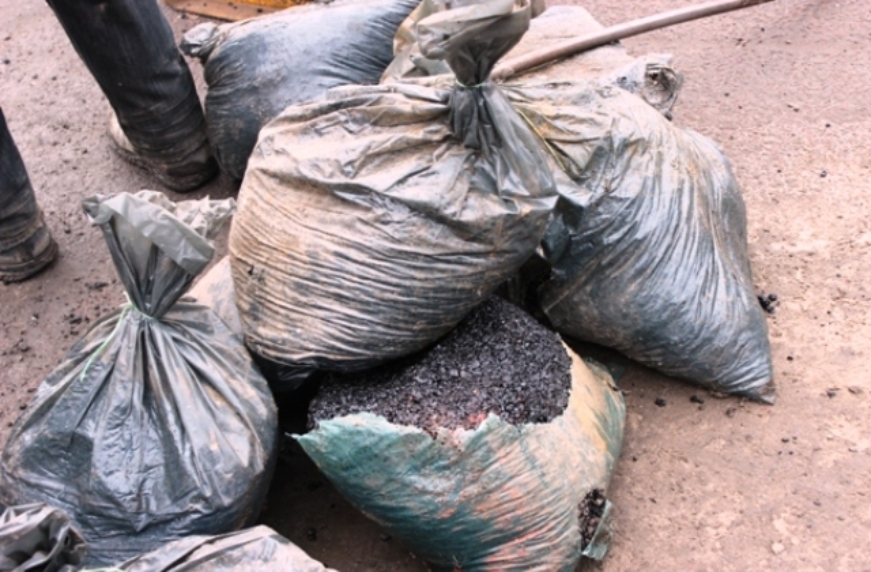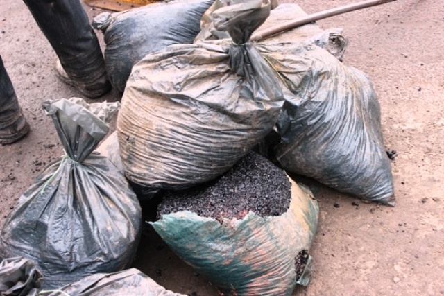 Приготовлений для ремонту матеріал привезли в пакетах, схожих на сміттєві. Дістаючи асфальт, працівники розбивали його ломом, попередньо розігріваючи за допомогою газового пальника.