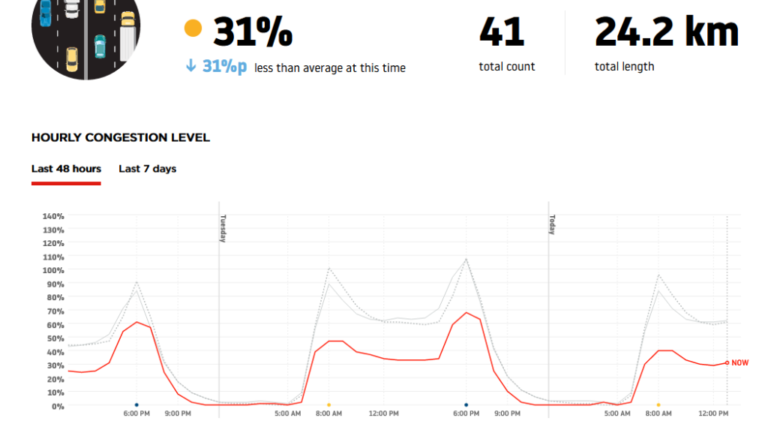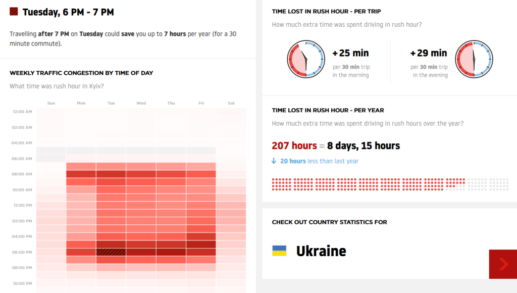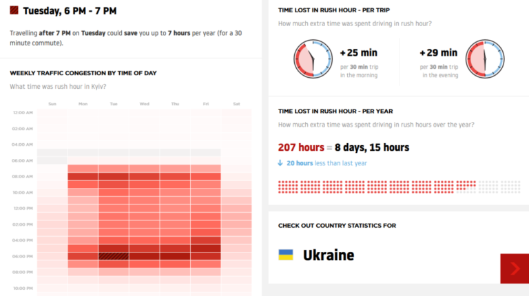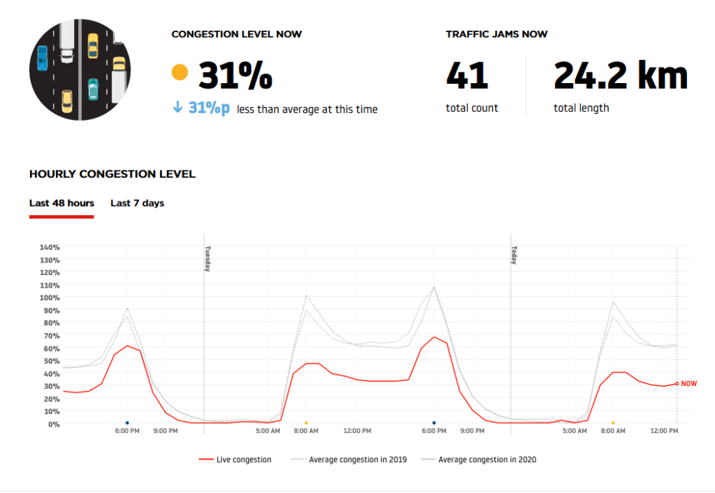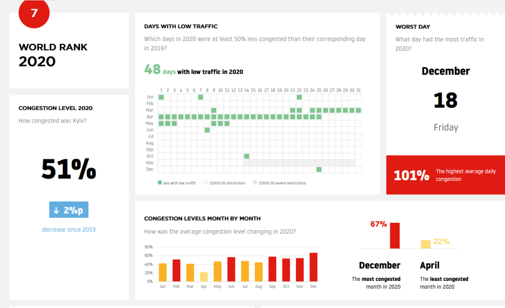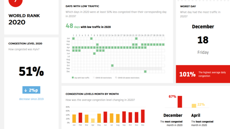 Середнє завантаження доріг у місті в 2020 році становило 51%. Найбільші затори спостерігалися в грудні, а найбільш завантаженим днем виявилося 18 грудня. Вільними дороги були навесні (з березня до травня), що цілком зрозуміло. Адже саме на цей період припав перший локдаун, пов’язаний із коронавірусом. У середньому водії витрачають в будній день (в години пік) на півгодинну поїздку близько 55 хвилин.