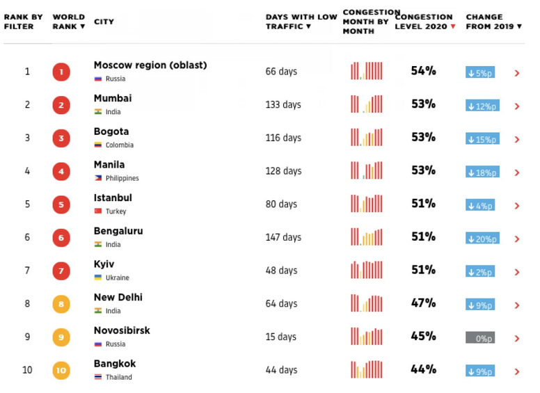 Перше місце в рейтингу за кількістю заторів посіла Москва і Московська область (54%), друге – індійський Мумбаї (53%), третє – колумбійська Богота (53%). Щодо інших українських міст, в першу двадцятку увійшли Одеса, яка посіла 11-те місце, і Харків – 13-те місце. Варто відзначити, що роком раніше Одеса була на вісімнадцятій позиції, А Харків і зовсім не увійшов до топ-20.