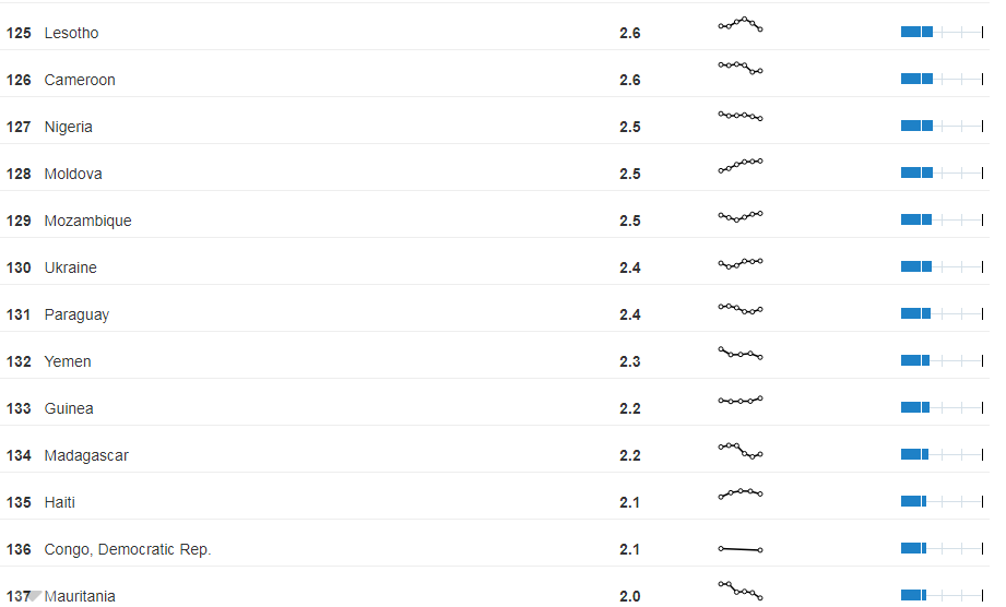 Украинские дороги, которые оценили в 2,4 балла из 7, оказались лучше лишь дорог Парагвая, Йемена, Гвинеи, Мадагаскара, Гаити, Конго и Мавритании. А вот обогнали Украину такие страны, как Камерун, Нигерия, Молдова и Мозамбик.