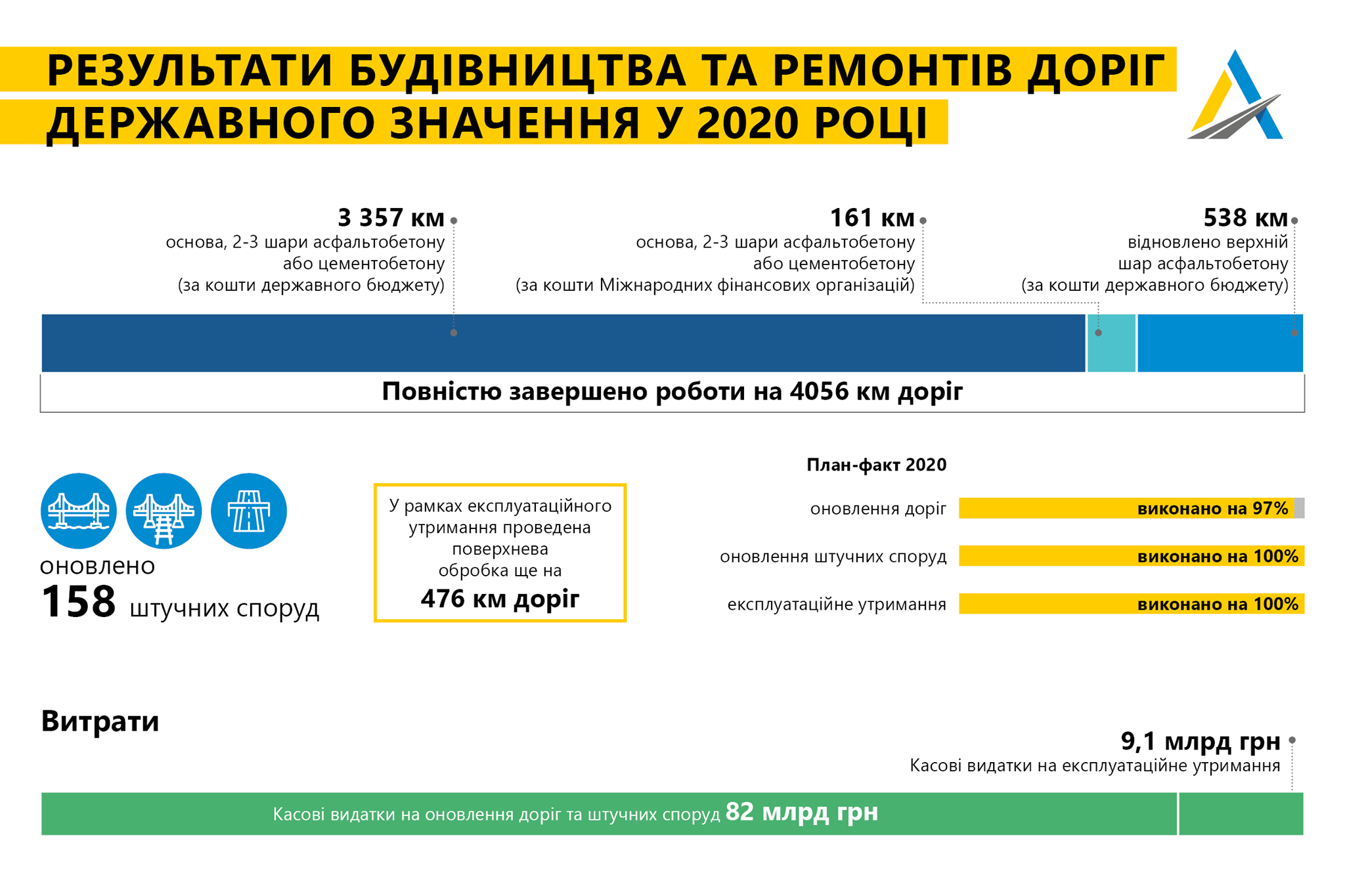 На оновлення доріг і штучних споруд було витрачено 82 мільярди грн, а на експлуатаційне утримання трас – 9,1 млрд гривень. Плани на 2021 рік озвучать пізніше.