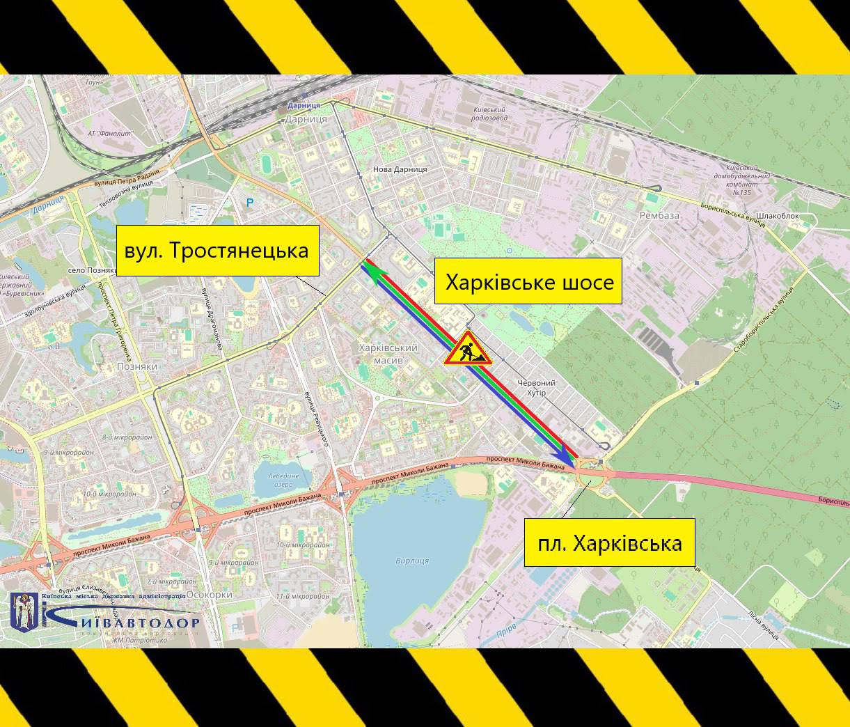 Обмеження пов’язані з початком капітального ремонту Харківського шосе. На першому етапі робіт обмеження діятиме на ділянці шосе від Харківської площі до вулиці Тростянецької на непарній стороні.
