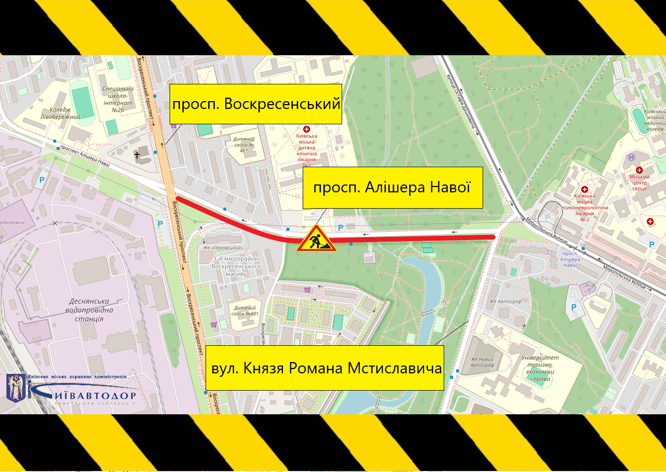 У Києві з 1 до 15 жовтня частково обмежать рух проспектом Алішера Навої, на ділянці від Воскресенського проспекту до вулиці Князя Романа Мстиславича, а із 2 до 5 жовтня, з 12:00 до 5:00, частково обмежуватимуть рух транспорту вул. Солом’янською в Соломʼянському районі столиці, Про це повідомляють у КК «Київавтодор».