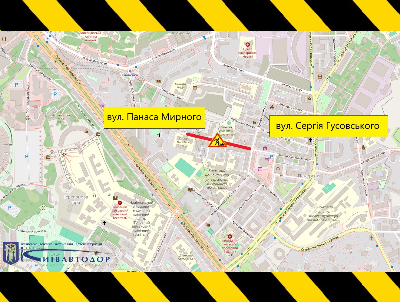 Із 26 вересня до 31 жовтня з 8:00 до 20:00 частково обмежуватимуть рух на вул. Панаса Мирного в Печерському районі столиці. Дорожні працівники проводитимуть поточний ремонт на ділянці від вул. Сергія Гусовського до вул. Панаса Мирного, 19. Про це повідомляють у КК «Київавтодор».