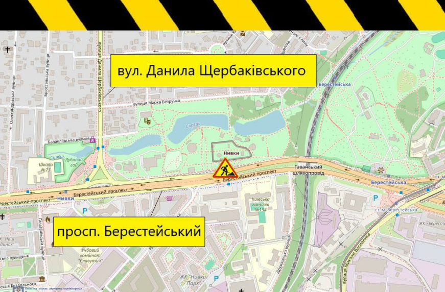У Києві 2 серпня, з 8:00 до 17:00, частково обмежуватимуть рух ділянкою Берестейського проспекту у напрямку на виїзд із міста біля зупинки громадського транспорту «Парк Нивки». Про це повідомляють у КК «Київавтодор».