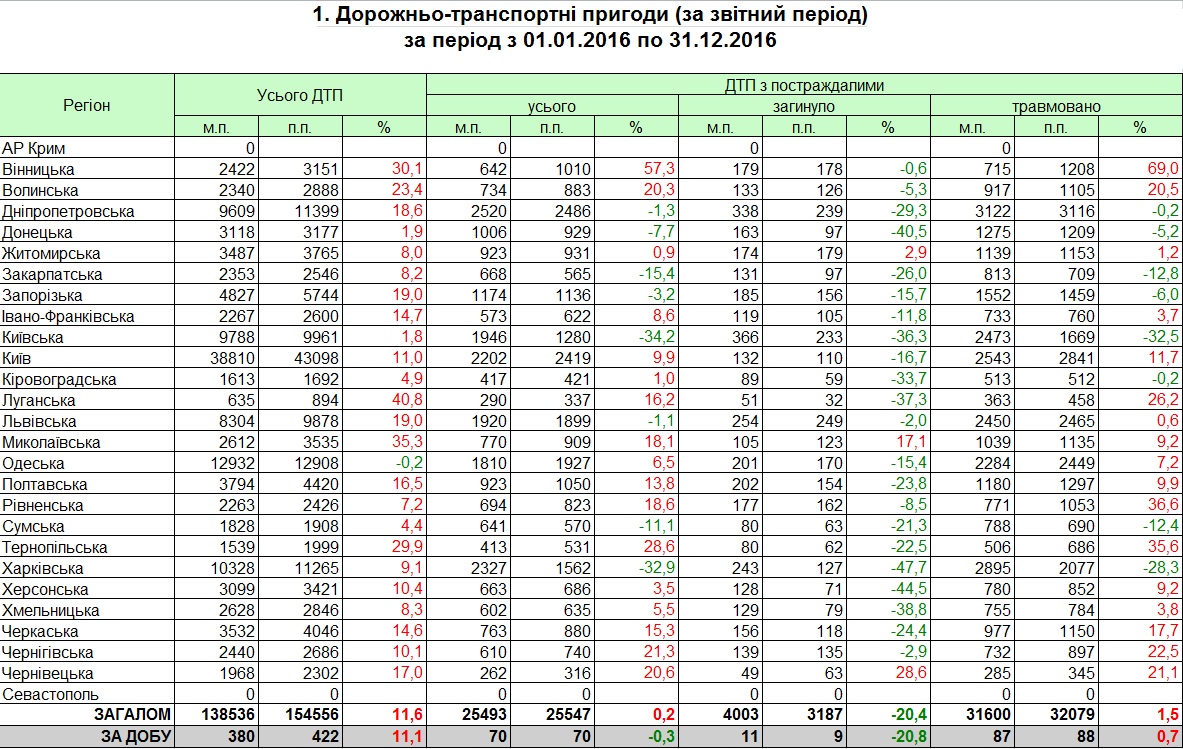 Те саме стосується порівняння даних щодо кількості загиблих у ДТП в 2015 і 2016 рр.