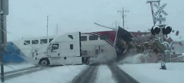 На відео швидкісний експрес врізається в автопоїзд, який переїжджає через залізничні колії. Водій вантажівки не порушував правил, адже шлагбаум на переїзді був піднятим. Можливо, причиною несправності обладнання стали рясні снігопади, які накрили центральну частину США.