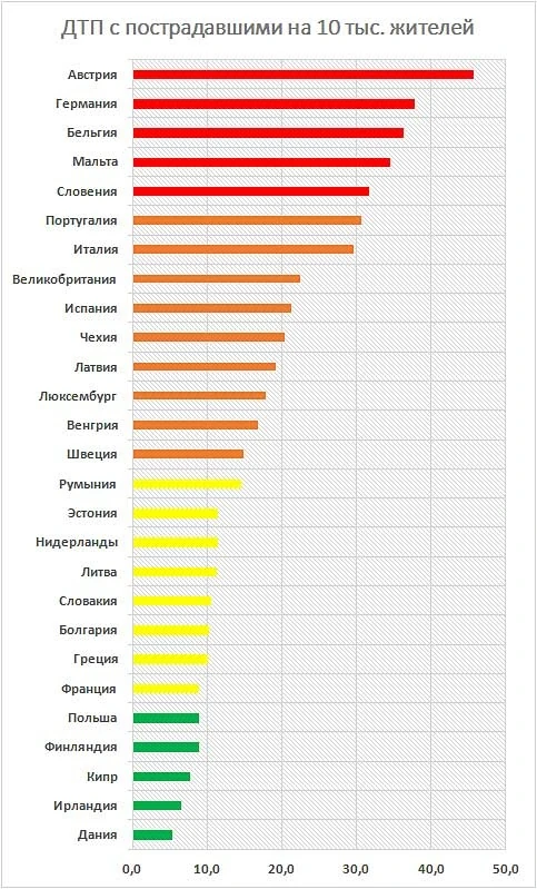 Еврокомиссия составила любопытную статистику, отображающую аварийную ситуацию на европейских дорогах. Рейтинг составлялся на основе расчета количества ДТП на 10 тысяч населения страны.