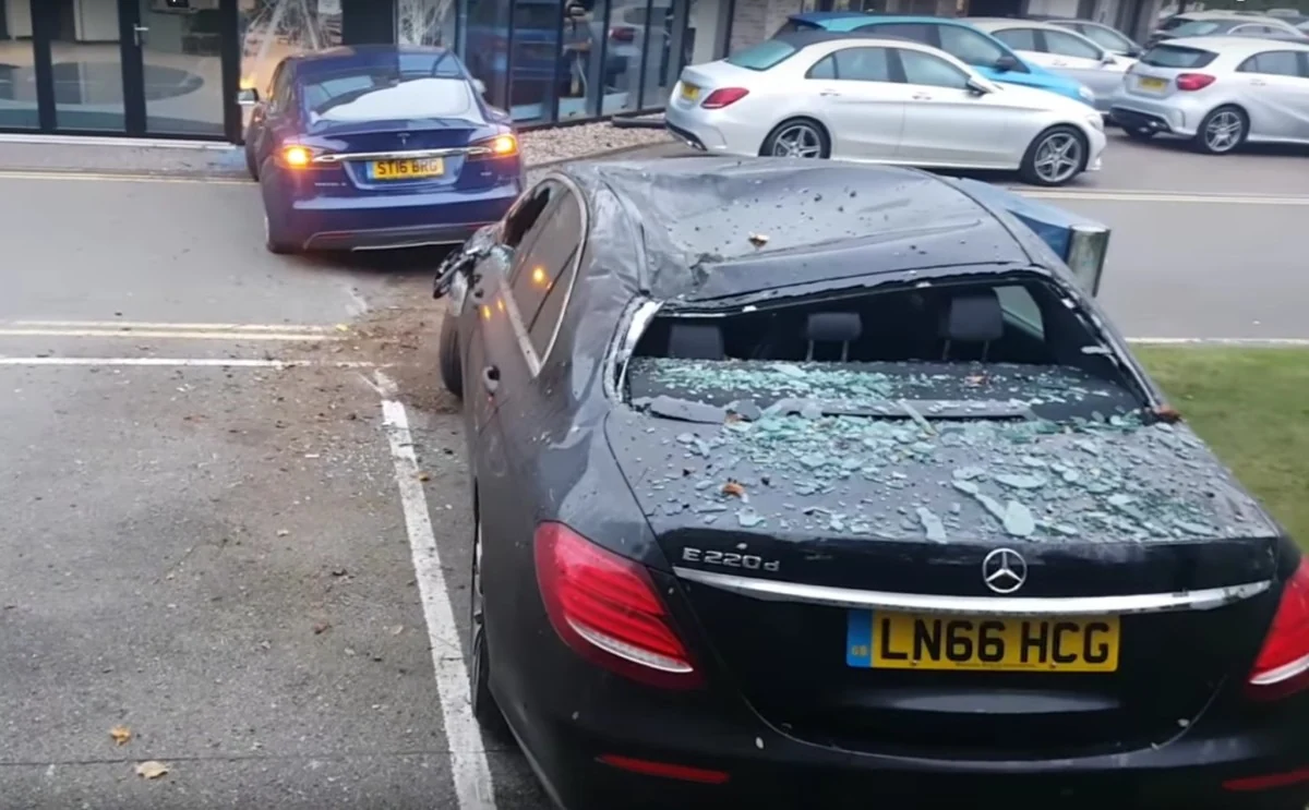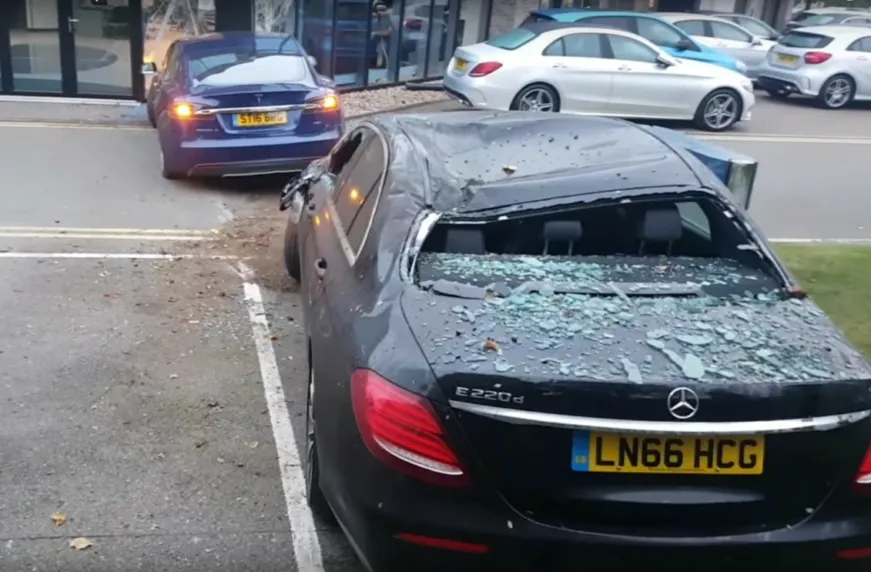 За парканом стояв автосалон Мерседес. Двотонний електрокар Тесла приземлився просто на дах нового Mercedes-Benz E-Class 2017, а потім влетів у скляну стіну шоу-руму Smart.