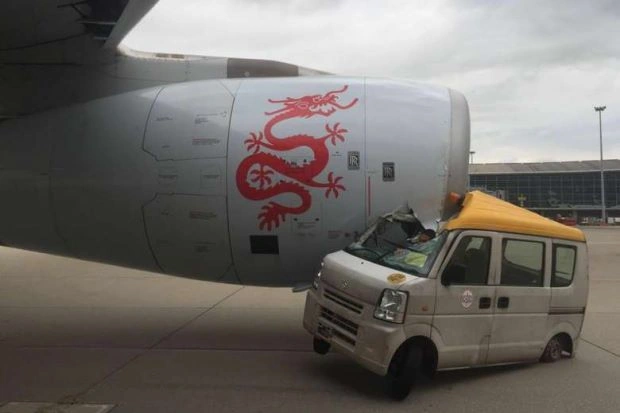 Airbus A330-300 придавив машину техобслуговування з такою силою, що водія довелося діставати з понівеченого авто з допомогою рятувальників. Аварія сталася в міжнародному аеропорту Гонконга.
