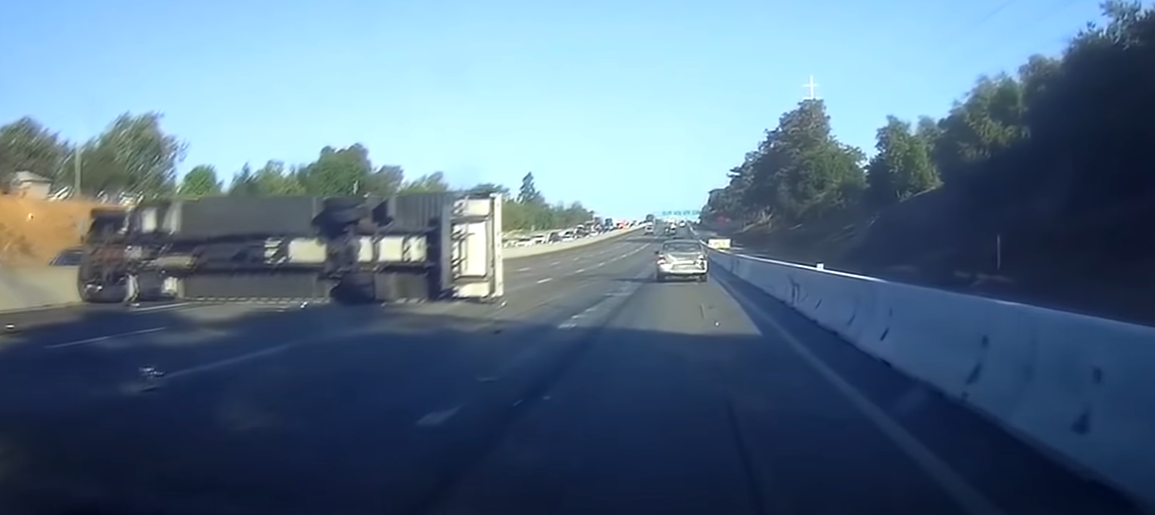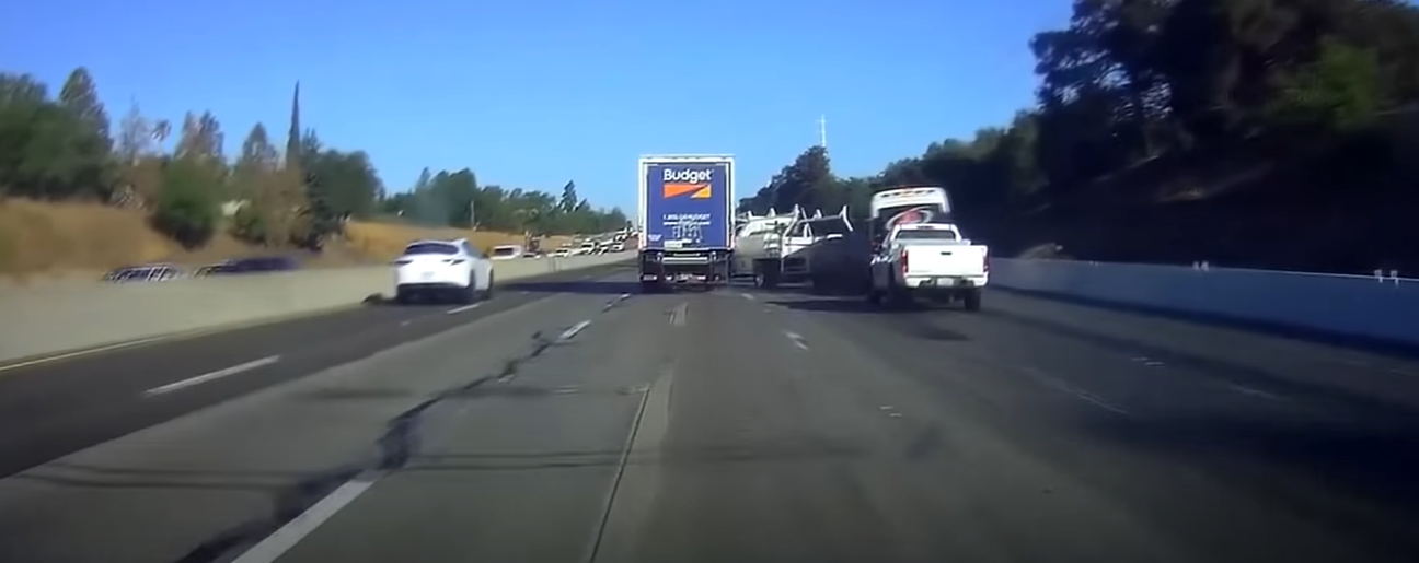 Ярким примером является авария, которая произошла на трассе в штате Калифорния (США). Водитель белого пикапа не удостоверился в безопасности маневра и, перестраиваясь из крайней левой полосы вправо, влетел в автомобиль скорой помощи. Последний по неизвестной причине сбросил скорость, и грузовичок не смог вовремя остановиться. В результате, микроавтобус въехал в более крупный пикап, а тот – в седан Cadillac CTS.