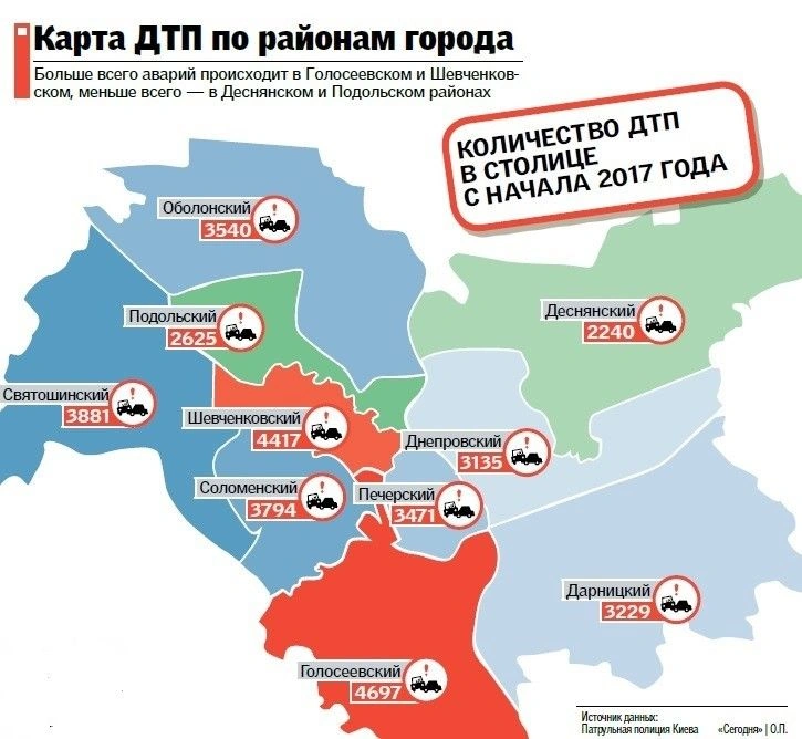 По данным Патрульной полиции, больше всего аварий в 2017 году зафиксировано в Голосеевском (4697) и центральном Шевченковском (4417) районах. Особенно опасным назвали Столичное шоссе, где с начала года отмечено 262 ДТП.