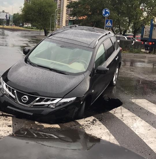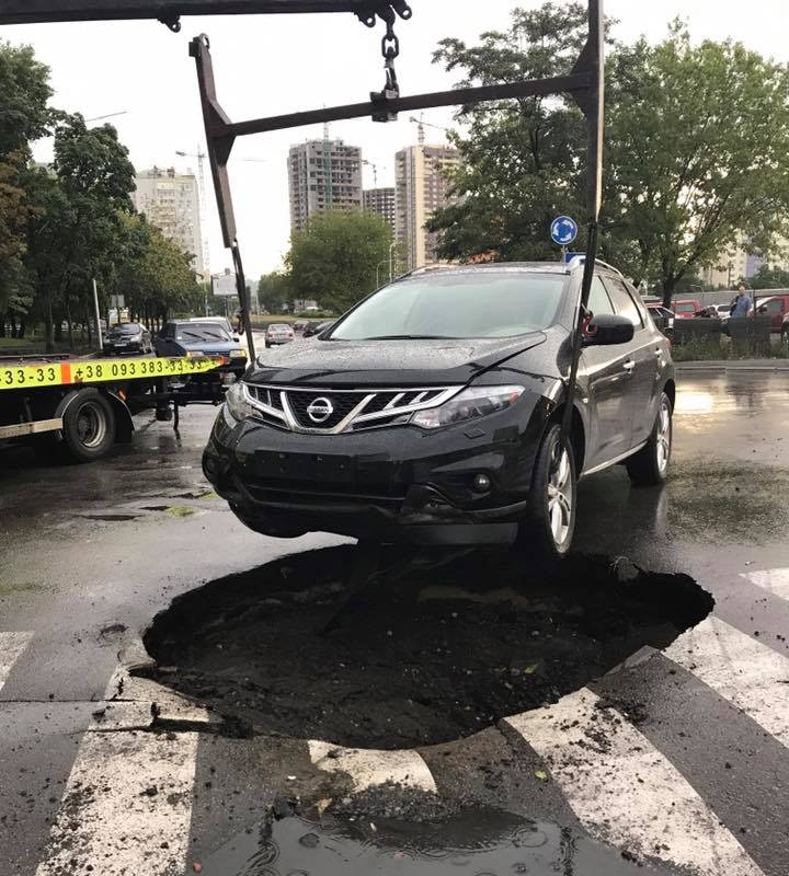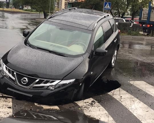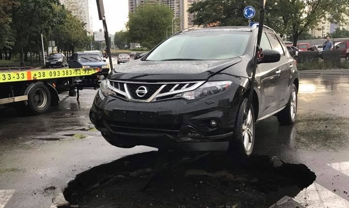 За словами власника, інцидент стався вчора на виїзді з Русанівських садів. Кросовер Nissan Murano потрапив у яму, що утворилася просто на пішохідному переході. Автомобіль зазнав серйозних пошкоджень, але, на щастя, ніхто з людей в ДТП не постраждав.
