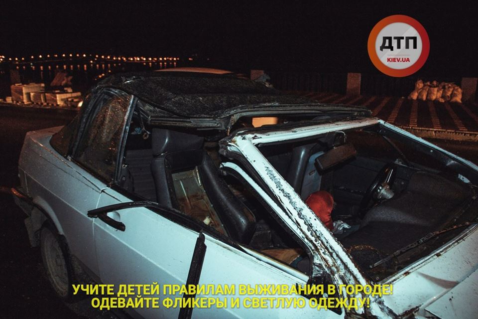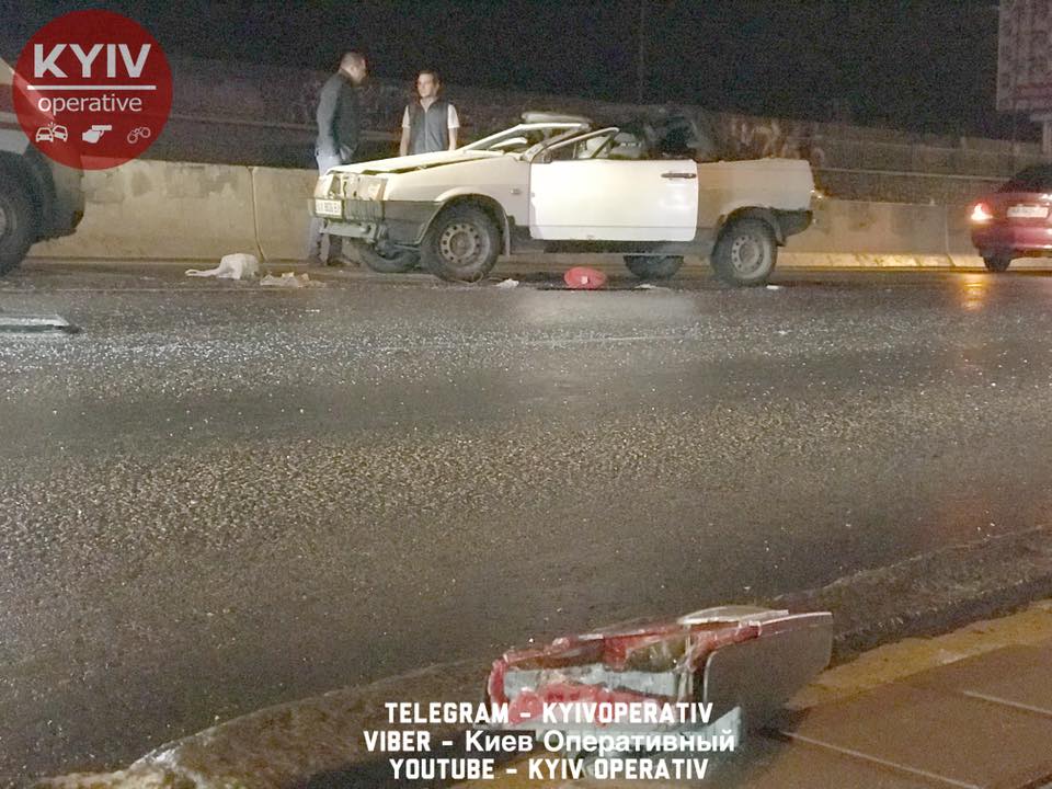 “Со слов полиции «немец» на большой скорости догнал в зад ВАЗ и от удара последнего начало кружить по дороге, а потом он два раза перевернулся в воздухе, и приземлился на колеса. Водитель «евробляхи» не справился с управлением, вылетел на обочину и остановился об гранитный парапет. Машины участники аварии очень разбиты, обоих водителей госпитализировали, у них закрытые черепно мозговые травмы и ушиб грудной клетки. Причину ДТП будет выяснять следствие”, – говорится в заметке на странице dtp.kiev.ua в соцсети Facebook.
