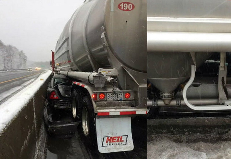 Ця аварія сталася на 101-му шосе, найбільшому між сходом і заходом у південній частині США. 34-річний водій Даніель Декоте рухався в лівому ряду за кермом купе Honda Civic. Порівнявшись з фурою неподалік міста Гемптон, сталося непередбачене. Автопоїзд занесло на слизькій дорозі, і він припечатав легковик до відбійника. Здавалося б, що від машини і водія мало що залишилося. Але все виявилося не так – водій Honda Civic вибрався неушкодженим через вікно зі сторони пасажира. Добре, що пасажирів у машині не було. А от водій вантажівки дістав незначних травм.