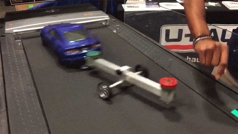 Для експерименту знадобилися конвеєрна стрічка і купе Ford Mustang. Не справжнє, а іграшкове. Маленький автомобіль буксирує причіп із невеликими гирями спереду і ззаду.