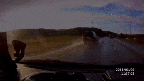 От удара на скорости 95 км/ч автомобиль потерял управление, слетел с дороги в кювет и перевернулся. Водитель остался невредим, хотя ни одна подушка безопасности не сработала. В последствии ему пришлось потратиться на серьезный кузовной ремонт.