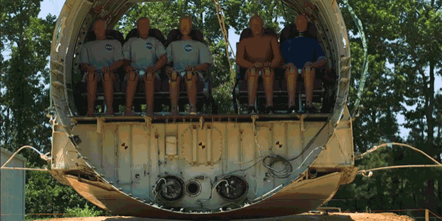 Фахівці NASA на полігоні в Ленглі показали, як проводять краш-тести літаків. Для цього було обрано секцію фюзеляжу авіалайнера з пасажирськими сидіннями, куди посадили манекени. Для випробування вибрали манекени людей різного віку, зросту та комплекції.