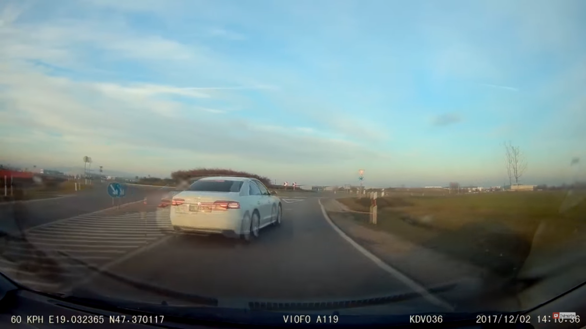 На этом видео запечатлен момент, как водитель белой Ауди демонстрирует опасное вождение перед круговым движением. Аварии удалось избежать лишь чудом.