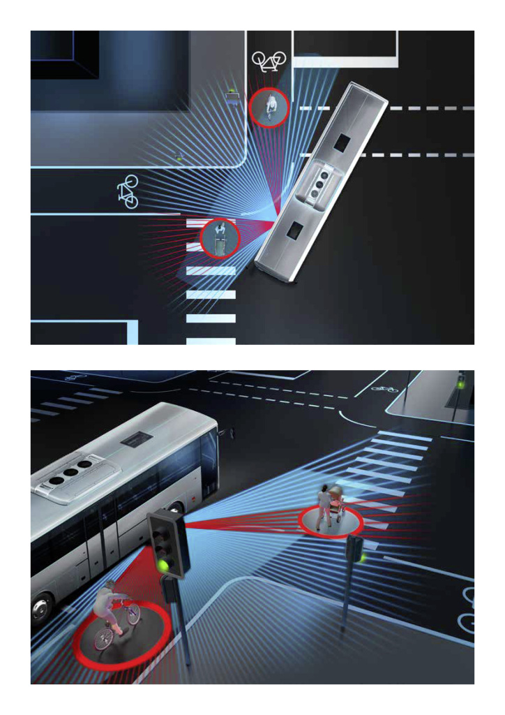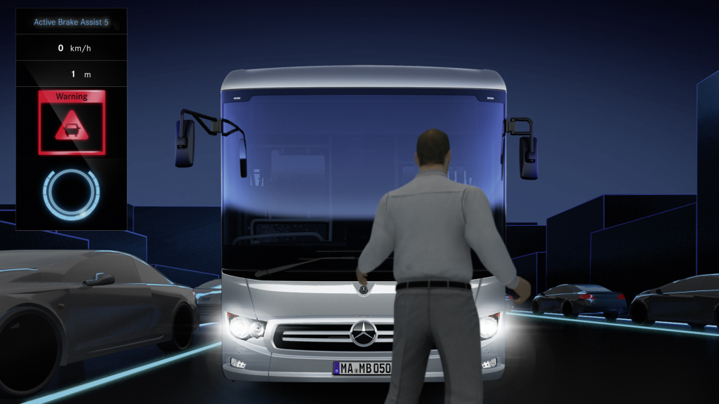 Междугородный автобус нового поколения Mercedes-Benz Intouro получил уникальную систему Active Brake Assist 5, которая позволяет избежать наезда на пешеходов и велосипедистов, задействуя торможение вплоть до полной остановки