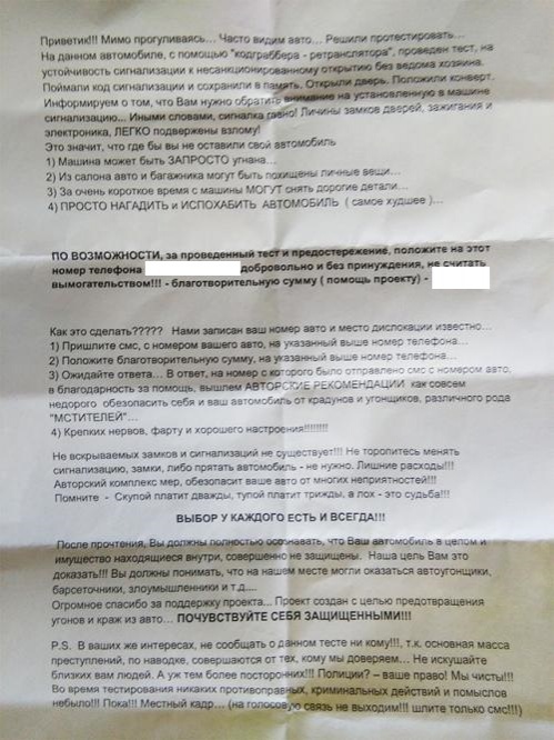У листі міститься інформація про те, що машина була легко відкрита і що наступного разу її можуть викрасти або пошкодити. Щоб цього не сталося, шахраї вдаються до звичайного шантажу. Вони пропонують кинути на певний номер телефону «благодійний внесок», тобто просто відкупитися грішми.