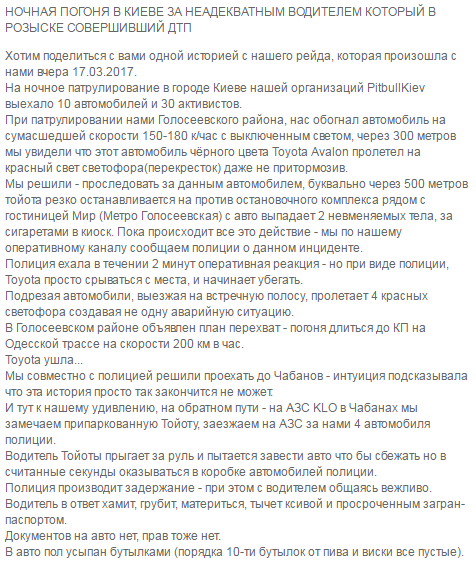 НОЧНАЯ ПОГОНЯ В КИЕВЕ ЗА НЕАДЕКВАТНЫМ ВОДИТЕЛЕМ КОТОРЫЙ В РОЗЫСКЕ СОВЕРШИВШИЙ ДТПХотим поделиться с вами одной историей с нашего рейда, которая произошла с нами вчера 17.03.2017. На ночное патрулирование в городе Киеве нашей организаций PitbullKiev выехало 10 автомобилей и 30 активистов. При патрулировании нами Голосеевского района, нас обогнал автомобиль на сумасшедшей скорости 150-180 к/час с выключенным светом, через 300 метров мы увидели что этот автомобиль чёрного цвета Toyota Avalon пролетел на красный свет светофора(перекресток) даже не притормозив. Мы решили – проследовать за данным автомобилем, буквально через 500 метров тойота резко останавливается на против остановочного комплекса рядом с гостиницей Мир (Метро Голосеевская) с авто выпадает 2 невменяемых тела, за сигаретами в киоск. Пока происходит все это действие – мы по нашему оперативному каналу сообщаем полиции о данном инциденте. Полиция ехала в течении 2 минут оперативная реакция – но при виде полиции, Toyota просто срываться с места, и начинает убегать. Подрезая автомобили, выезжая на встречную полосу, пролетает 4 красных светофора создавая не одну аварийную ситуацию. В Голосеевском районе объявлен план перехват – погоня длиться до КП на Одесской трассе на скорости 200 км в час. Toyota ушла… Мы совместно с полицией решили проехать до Чабанов – интуиция подсказывала что эта история просто так закончится не может. И тут к нашему удивлению, на обратном пути – на АЗС KLO в Чабанах мы замечаем припаркованную Тойоту, заезжаем на АЗС за нами 4 автомобиля полиции. Водитель Тойоты прыгает за руль и пытается завести авто что бы сбежать но в считанные секунды оказываться в коробке автомобилей полиции. Полиция производит задержание – при этом с водителем общаясь вежливо. Водитель в ответ хамит, грубит, материться, тычет ксивой и просроченным загран-паспортом. Документов на авто нет, прав тоже нет. В авто пол усыпан бутылками (порядка 10-ти бутылок от пива и виски все пустые). Итог задержания: Данный автомобиль находиться в розыске около года – за численные нарушения правил дорожного движения, 6 раз скрывался от полиции. 1 раз был задержан – передал права и тех паспорт полицейским для составления протокола, сел за руль и скрылся в неизвестном направлении. За 3 часа до нашего задержания – был в ориентировке полиции Печерского района, так как совершил ДТП с 2 пострадавшими автомобилями. Вот такие упыри ездят по ночам в нашем родном городе. Друзья присоединяйтесь к нам к нашему сообществу, давайте сделаем наш город чище.🇺🇦🇺🇦🇺🇦🇺🇦