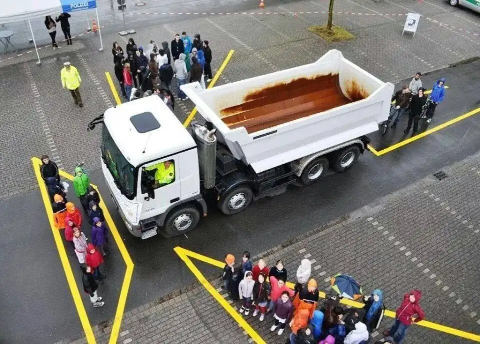 Поэтому, чтобы донести эту важную информацию для участников движения, немецкие полицейские решили наглядно показать слепые зоны грузовиков, расставив живых людей вокруг самосвала Mercedes-Benz Actros. Самосвал выбран не случайно, ведь именно строительные большегрузы чаще всего разъезжают по городу.
