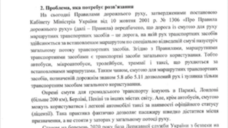 Смуга для громадського транспорту призначена тільки для тих транспортних засобів, які перевозять пасажирів і пересуваються певним маршрутом, а виїзд на неї приватним автомобілям категорично заборонений. За порушення цього правила в КУпАП передбачено штраф у розмірі 30 неоподатковуваних мінімумів доходів громадян, тобто 510 гривень. Мініфраструктури вирішило внести деякі зміни до правил і запропонувало розширити список тих, кому дозволено пересуватися цією смугою. Йдеться про автомобілі служб таксі.