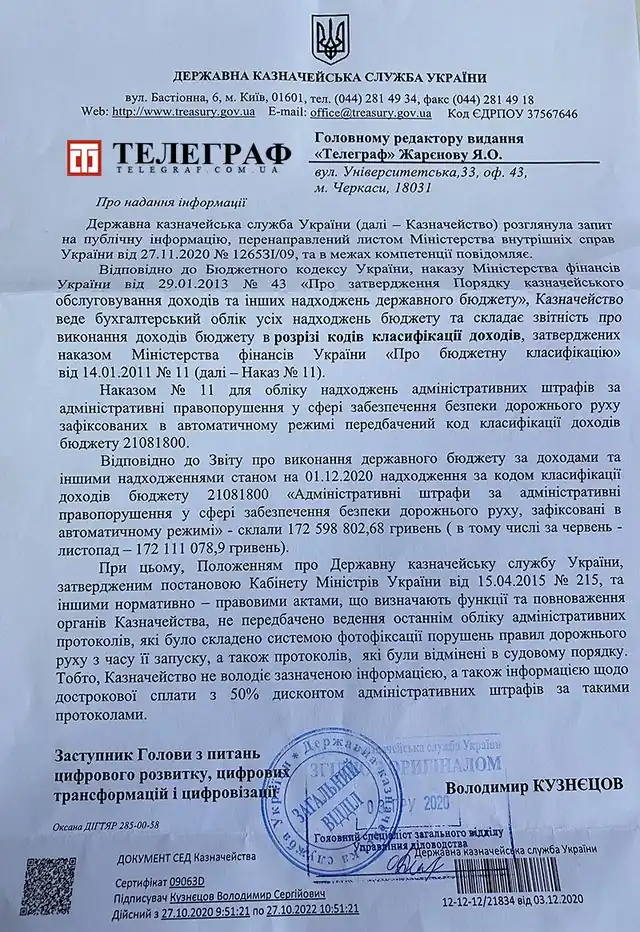 За даними Державної казначейської служби України, з 1 червня по 1 грудня 2020 року водії сплатили до бюджету країни 172 598 802,68 грн штрафів за порушення ПДР, зафіксовані в автоматичному режимі. До речі, в цій цифрі не враховані штрафи, які були оплачені упродовж 10 днів після отримання, і, як наслідок, були зменшені вдвічі. Тобто підсумкова цифра як мінімум на чверть більша за зазначену, повідомляє Телеграф.