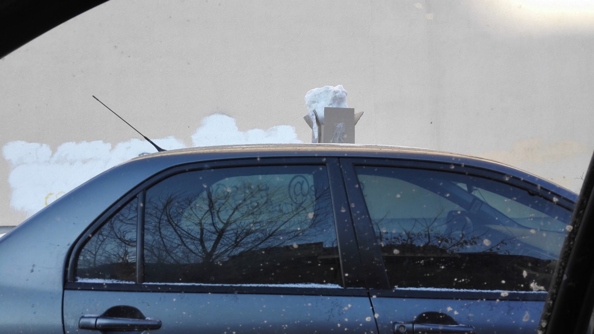 Один из прохожих не сдержался и, достав пустую коробку из мусорного бака, насыпал в нее снега и оставил «сувенир» на крыше машины.