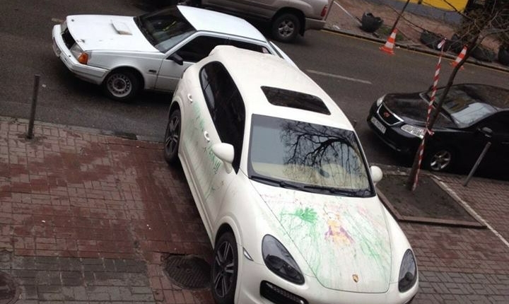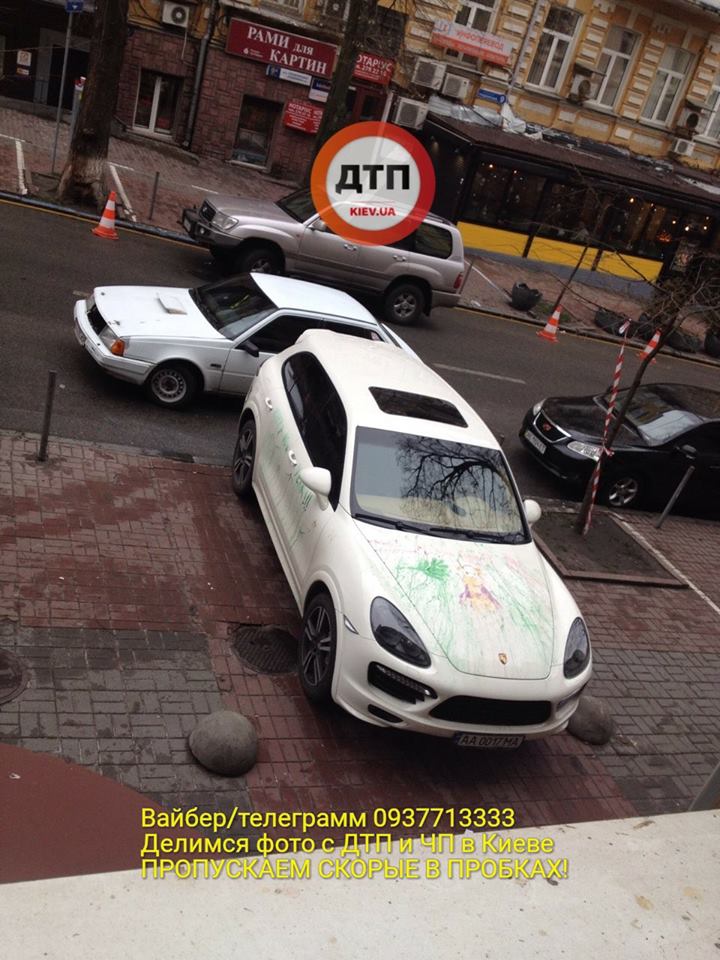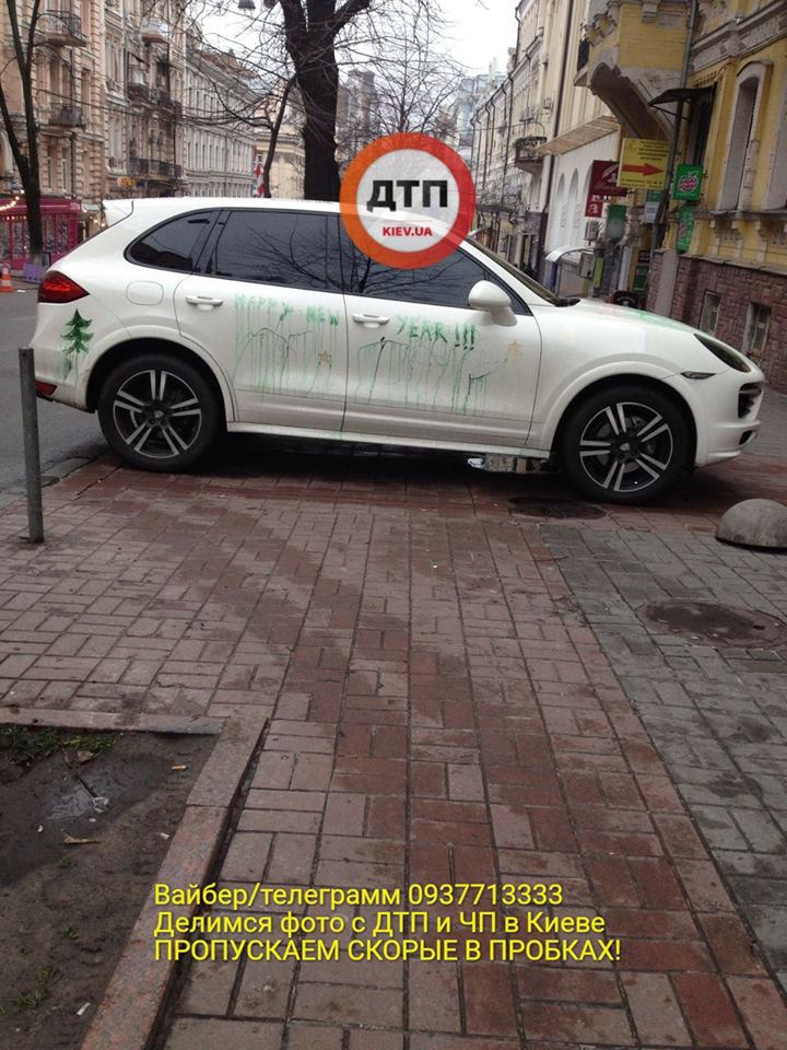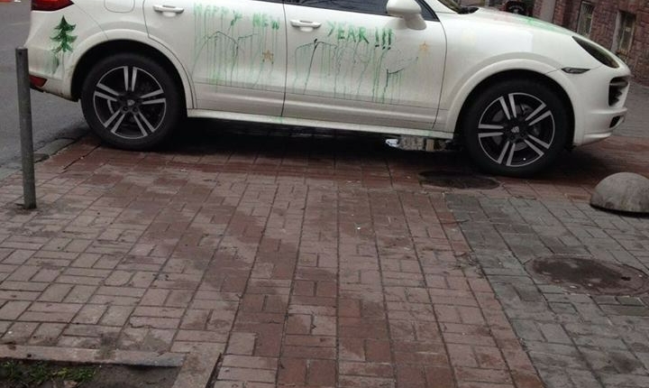 Так, возле станции метро Театральная владельца кроссовера Porsche Cayenne ждал неприятный сюрприз: его машину разукрасили краской. Кроме того, не обошлось без тематических новогодних надписей на кузове машины.