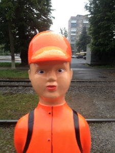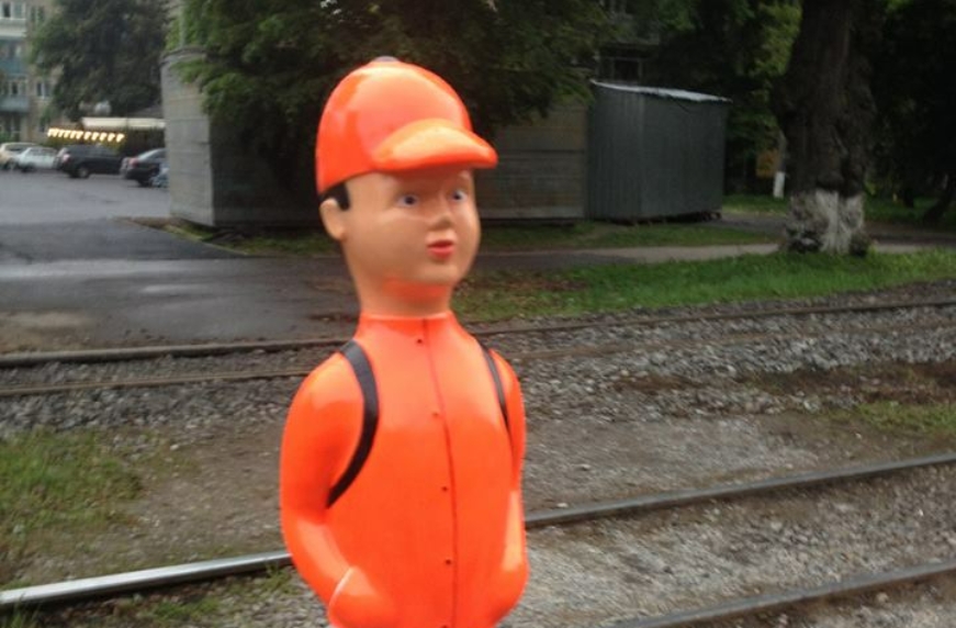 Манекен виконано у вигляді дитини зі шкільним ранцем, на якому красується напис «Увага». Він яскраво-помаранчевий, а тому добре помітний на великій відстані.