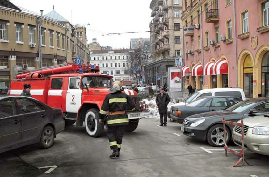 В рации слышен голос сотрудника ГАИ, который находится в пожарном автомобиле. Он передает информацию о нарушителях патрульным на маршруте движения: «Красная Honda Accord, госномер …, перестроился в левый ряд перед автомобилем с включенным спецсигналом, черный Lexus госномер …, не пропустил пожарный автомобиль». Голос в рации практически не умолкает. Колонна проезжает Крещатик и пытается развернуться за Европейской площадью. Напрасно торопимся. Из примерно двух десятков проехавших машин не остановилась ни одна. Патрульная машина ГАИ с включенной сиреной выезжает из-за пожарной, пытаясь бортом прикрыть ее от потока. Наконец подействовало! Медленно приближающийся рейсовый автобус останавливается.