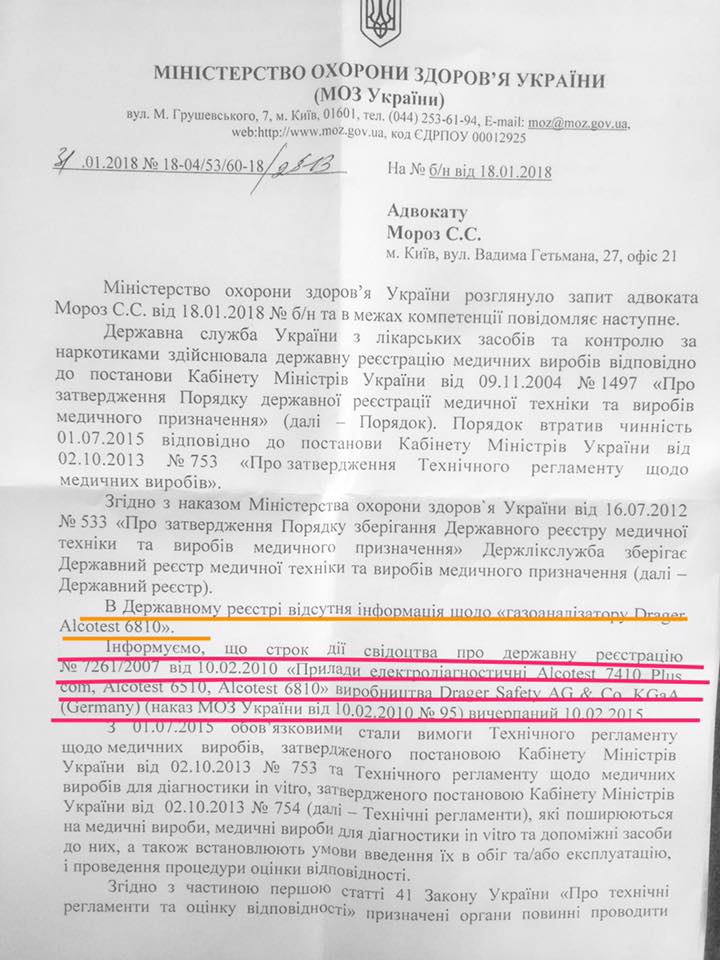 В документе также сообщается, что в Государственном реестре медицинской техники и изделий медицинского назначения информация о Dräger Alcotest 6810 отсутствует и никаких данных от органов оценки соответствия в Государственную службу Украины по лекарственных средствах не поступало.