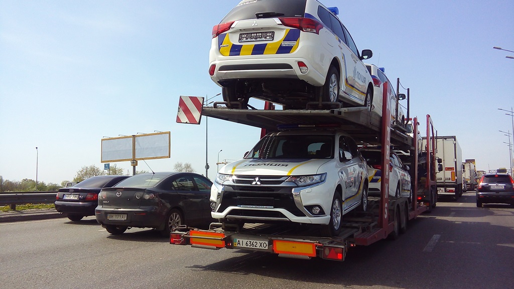 Кореспондент «Автоцентру» зафіксував перевезення гібридних автомобілів Mitsubishi Outlander PHEV для Національної поліції України. Машини рухалися на кількох автовозах Південним мостом столиці в напрямку центру міста.