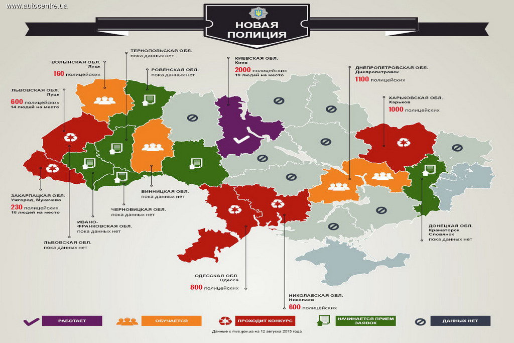 Сегодня патрульная полиция работает в Киеве, готовится выйти на работу в Днепропетровской, Волынской и Хмельницкой области. В сентябре-октябре стартует набор патрульных полицейских еще в пяти областях Украины – Тернопольской, Ровенской, Черновицкой, Винницкой, Ивано-Франковской областях. Здесь новые полицейские подразделения будут сформированы в январе-феврале, возможно, в конце декабря.