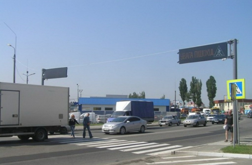 Ноу-хау от ГАИ появилось в поселке Софиевская Борщаговка Киево-Святошинского района (в районе поворота с Окружной дороги на Вишневое около «Автоцентра на Кольцевой»). Как сообщает пресс-служба ГАИ, пешеходный переход с дополнительным информационным табло был установлен по инициативе Управления ГАИ в Киевской области с целью предотвращения наездов на пешеходов. Дело в том, что этот нерегулируемый пешеходный переход – аварийно-опасный. Он находится на закругленном участке дороги, и здесь часто происходят наезды на пешеходов, поскольку транспорт движется в две полосы движения в каждом направлении, и водители не всегда могут увидеть выход пешехода на проезжую часть.