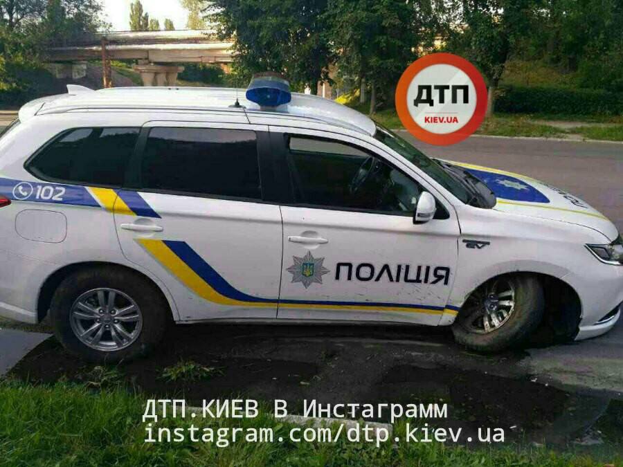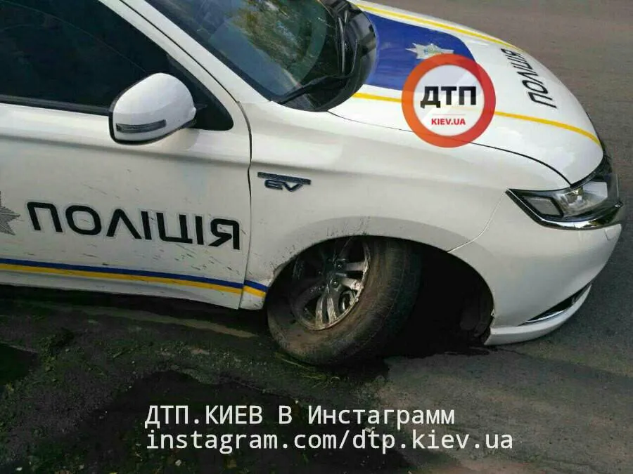 Судячи з фото, у поліцейського Міцубісі Аутлендер пошкоджена передня вісь і вирвано колесо. Офіційно причина аварії поки що не названа, але, найімовірніше, гібрид Mitsubishi потрапив у глибоку яму на дорозі або відкритий каналізаційний люк.