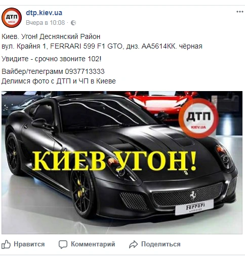 "Киев. Угон! Деснянский Район. ул. Крайняя, 1, FERRARI 599 F1 GTO, днз. АА5614КК. чёрная. Увидите - срочно звоните 102", - говорится в заметке.
