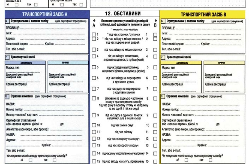 В конце февраля этого года Верховна Рада Украины приняла Закон «О внесении изменений в некоторые законодательные акты Украины о дорожно-транспортных происшествиях и выплатах страхового возмещения». Он предусматривает упрощение оформления материалов ДТП, в которых повреждены только обеспеченные страховкой транспортные средства и нет травмированных либо погибших. В данном случае участники аварии могут воспользоваться уведомлением о ДТП (так называемым европротоколом) и оформить происшествие без ГАИ. Кроме того, если участники ДТП воспользовались европротоколом, то виновник аварии избегает административной ответственности (согласно ст. 124 КоАП Украины предполагается штраф 340–425 грн. или лишение прав на 6–12 месяцев).
