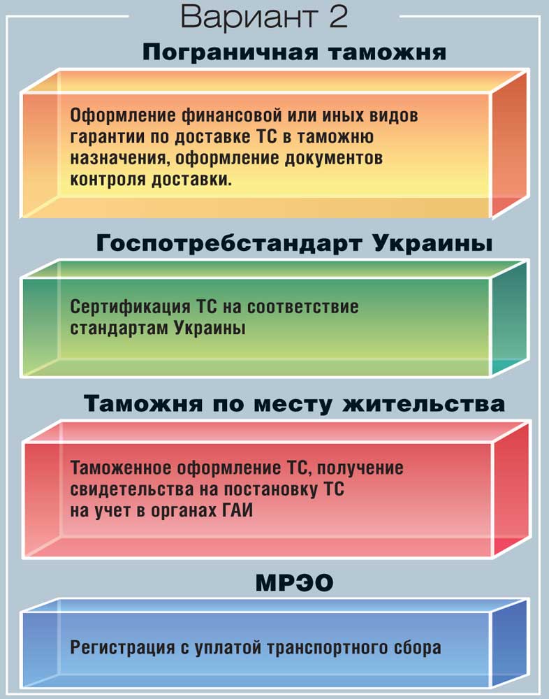Если же такая декларация по месту жительства граждан не оформлялась (вариант 2), то на пограничной таможне, через которую ввозится автомобиль, составляют акт его таможенного осмотра и оформляют документы контроля за доставкой машины на внутреннюю таможню. При этом в соответствии со статьей № 161 Таможенного кодекса Украины обязательно применяется одна из мер гарантирования доставки (финансовая гарантия, охрана и сопровождение таможенным органом, перевозка таможенным перевозчиком).