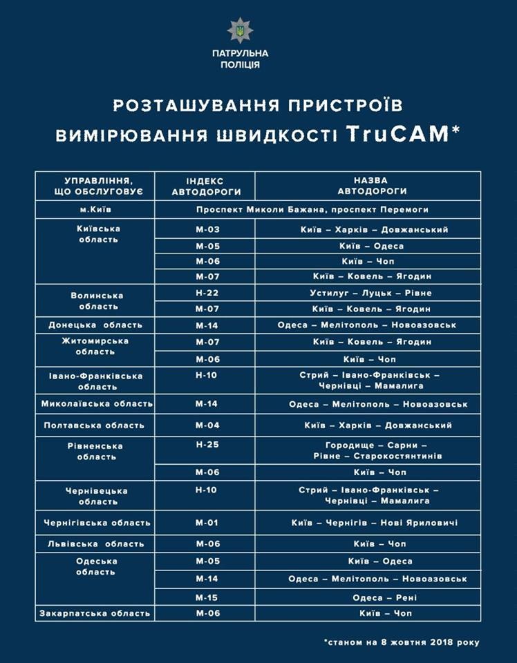 Сьогодні, 8 жовтня, екіпажі патрульної поліції України вийдуть на службу з радарами контролю швидкості TruCam. На своєму офіційному сайті відомство опублікувало перелік автодоріг, де будуть використовувати нові прилади.