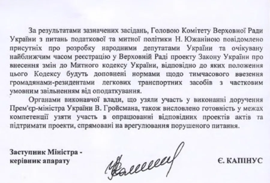 Як йдеться у листі, за результатами двох засідань у Комітеті з питань податкової та митної політики Верховної Ради України, які відбулися 7 і 13 жовтня за участю Москаля і представників так званих «пересічників», найближчим часом очікується реєстрація у Верховній Раді відповідного законопроекту. Передбачається, що положення Митного кодексу України будуть доповнені нормами тимчасового ввезення громадянами-резидентами легкових транспортних засобів з частковим умовним звільненням від оподаткування.
