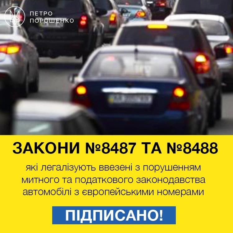 Епосі нерозмитнених авто, схоже, настав кінець: Президент України Петро Порошенко підписав закони №8487 і 8488, які передбачають легалізацію авто на єврономерах і нові правила розмитнення. Про це глава держави написав на своїй сторінці в Facebook.