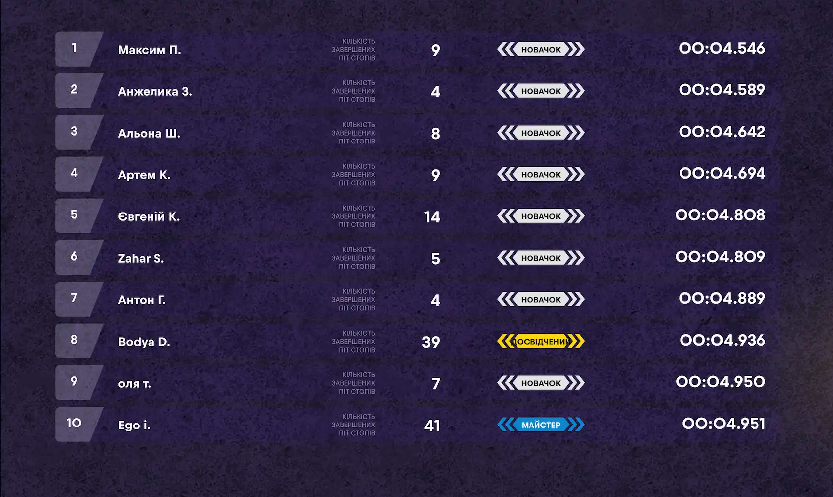 У змаганні взяли участь 32 561 гравців, а разом вони зіграли 62 638 ігор. Найкращий результат в 4,546 секунди з дев'ятої спроби показав Максим П. На другому та третьому місцях дві дівчини – Анжеліка З. та Альона Ш. з результатами 4,589 і 4,642 с відповідно. Найзавзятішим гравцем був Дмитро з Одеси, який повністю пройшов гру 107 разів. У фінальній же «десятці» найбільше грали «механіки» з Києва та Львова.