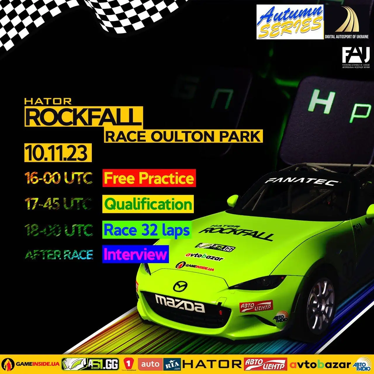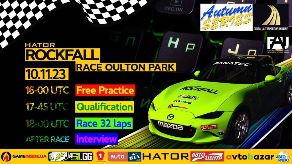 8Rockfall Race Oulton Park – саме таку гармоничну та яскраву назву носитиме п’ятий етап Міжнародної Серії змагань "Digital Autosport of Ukraine: Autumn Series-23", який відбудеться цієї п’ятниці, 10 листопада. Rockfall Series – це провідна серія клавіатур від українського виробника HATOR.